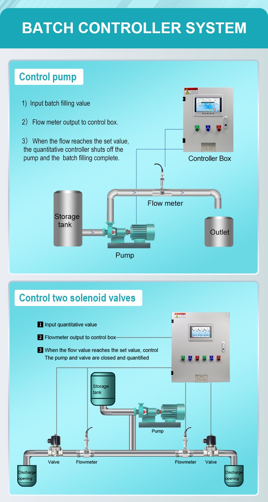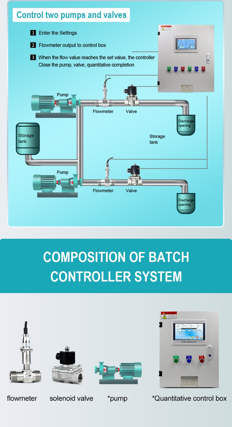 The batch filling controller system is composed of a quantitative control box, a flowmeter, an electromagnetic valve and a pump. It has three quantitative methods: controlling the pump, controlling the valve and simultaneously controlling the pump and the electromagnetic valve. It is suitable for quantitative water addition, quantitative material issuance and quantitative filling sites. The button-operated quantitative control box features simple operation with one-touch start and reset, supports RS485 and 4-20mA signal input, cumulative report query, and can be customized as an explosion-proof model.