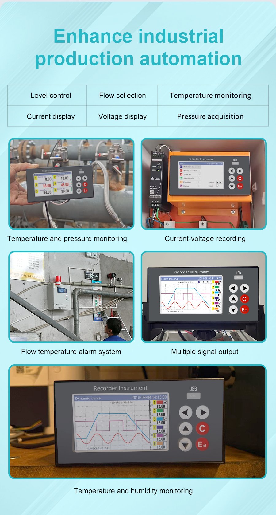 GT68R Data Logger – 4-inch button color screen, real-time curve/historical curve one-click switching, multiple interfaces intuitive display. It is applicable to various working conditions such as pipeline pressure monitoring and data alarm monitoring, and is compatible with various sensors including pressure, flow and liquid level sensors. A 1-second sampling period, 0.2% high-precision measurement, 1-6 analog signal inputs, 1-6 relay outputs, and equipped with a USB2.0 high-speed data backup interface. Provide reliable process control and quality traceability solutions for enterprises