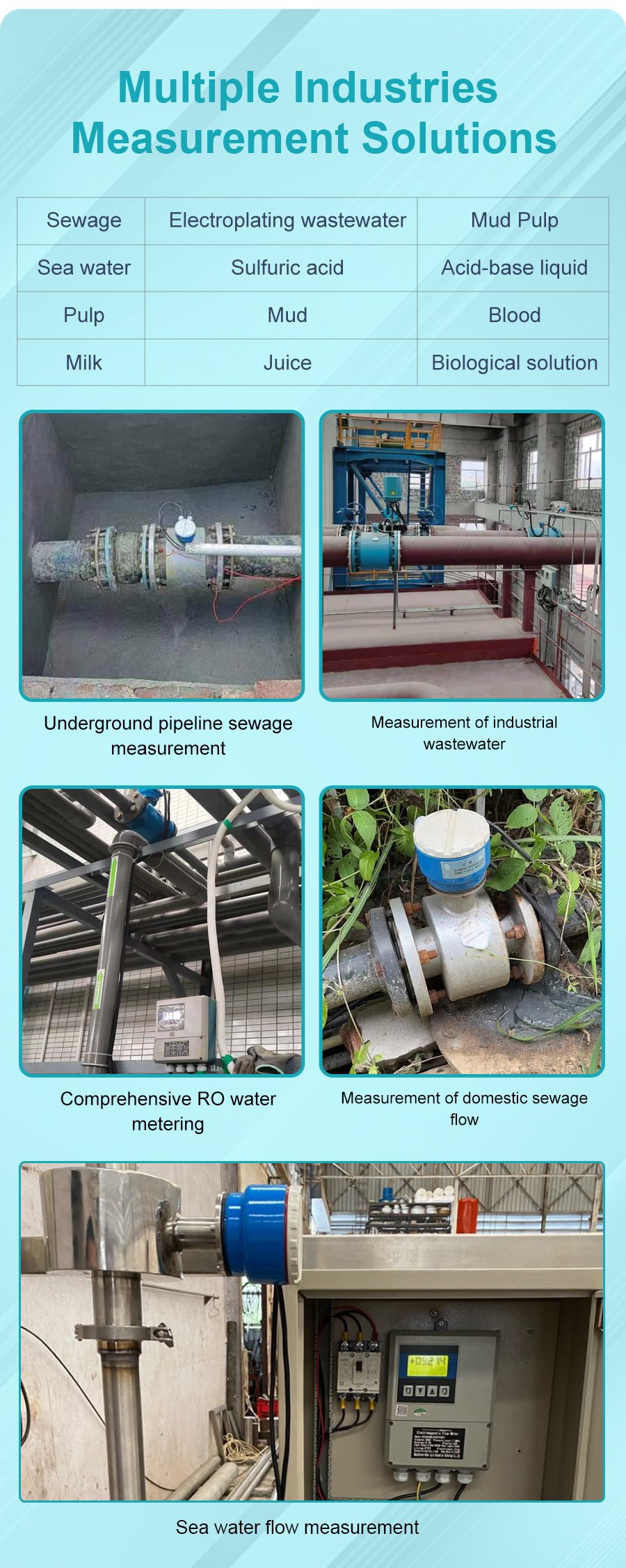 GTEF50 series electromagnetic flowmeters utilize a Chinese-English electromagnetic converter and a high-speed CPU core. They offer extremely fast computing speed, high accuracy, and reliable measurement performance. The conversion circuit boasts a high input impedance of 750Ω, a common-mode rejection ratio exceeding 100dB, and better than 90dB of external interference and 60Hz/50Hz interference rejection. The valve body is constructed of carbon steel, offering high structural strength, strong pressure-bearing capacity, and relatively affordable cost. Suitable media include water, non-corrosive liquids, and abrasive slurries (relying on protective linings). Common applications include mining slurries, cement slurries, coal-water slurries in the power industry, non-corrosive high-pressure fluids, and certain sections of sewage treatment plants. The sensor utilizes non-uniform magnetic field technology and a unique magnetic circuit structure, resulting in a stable and reliable magnetic field. Connection options include flanges, threads, and clamps. The valve body can be lined with rubber, polytetrafluoroethylene, and other materials. A variety of power supplies are available, including 85-265V/45-63Hz, DC24V, and battery.